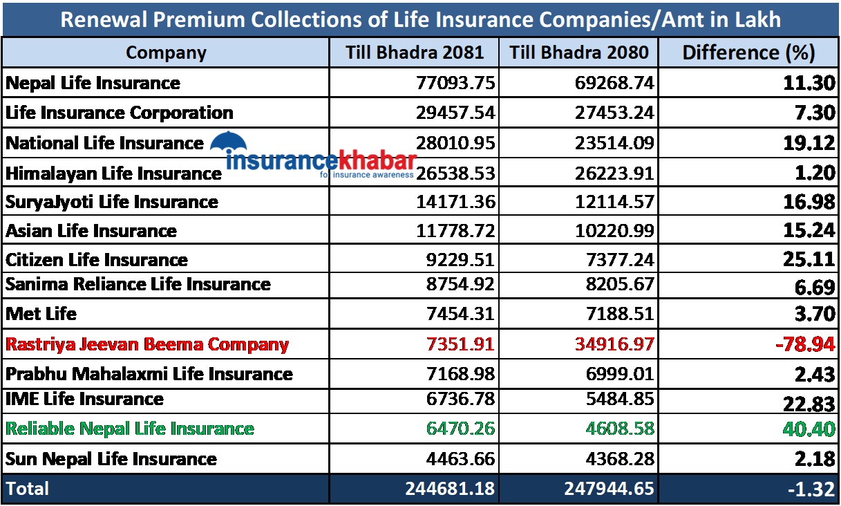 चालु आर्थिक वर्षको भदौसम्म सर्वाधिक नवीकरण बीमाशुल्क आर्जन गर्नेमा नेपाल लाइफ रहेको भने बढोत्तरीको हिसाबले रिलायबल नेपाल लाइफ अग्रस्थानमा रहेको छ। समीक्षा अवधिमा नेपाल लाइफले ७ अर्ब ७० करोड ९३ लाख रुपैयाँ नवीकरण बीमाशुल्क आर्जन गरेको छ।अघिल्लो वर्ष भदौसम्म नेपाल लाइफले ६ अर्ब ९२ करोड ६८ लाख रुपैयाँ नवीकरण बीमाशुल्क आर्जन गरेको थियो। अघिल्लो वर्षको तुलनामा समीक्षा अवधिमा ११.३० प्रतिशत बढेको छ।