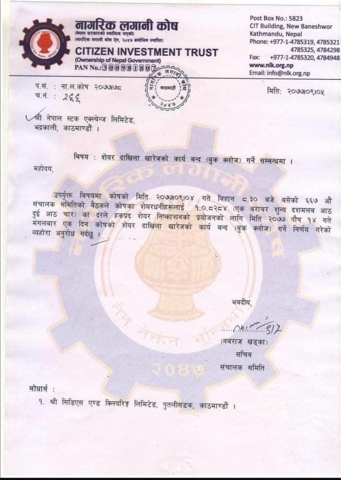 काठमाडौं । नागरिक लगानी कोषले हकप्रद शेयर निष्कासनका लागि बुकक्लोज मिति तय गरेको छ ।कोषले हकप्रद शेयर निष्काशन गर्ने प्रयोजनका लागि पौष १४ गते, एक दिनका लागि बुक क्लोज गर्ने निर्णय गरेको हो । त्यसकारण, पौष १३ गतेसम्म नेप्सेमा कारोबार भई कायम शेयरधनीहरुले मात्र उक्त हकप्रद शेयरमा आवेदन दिन पाउनेछन् ।