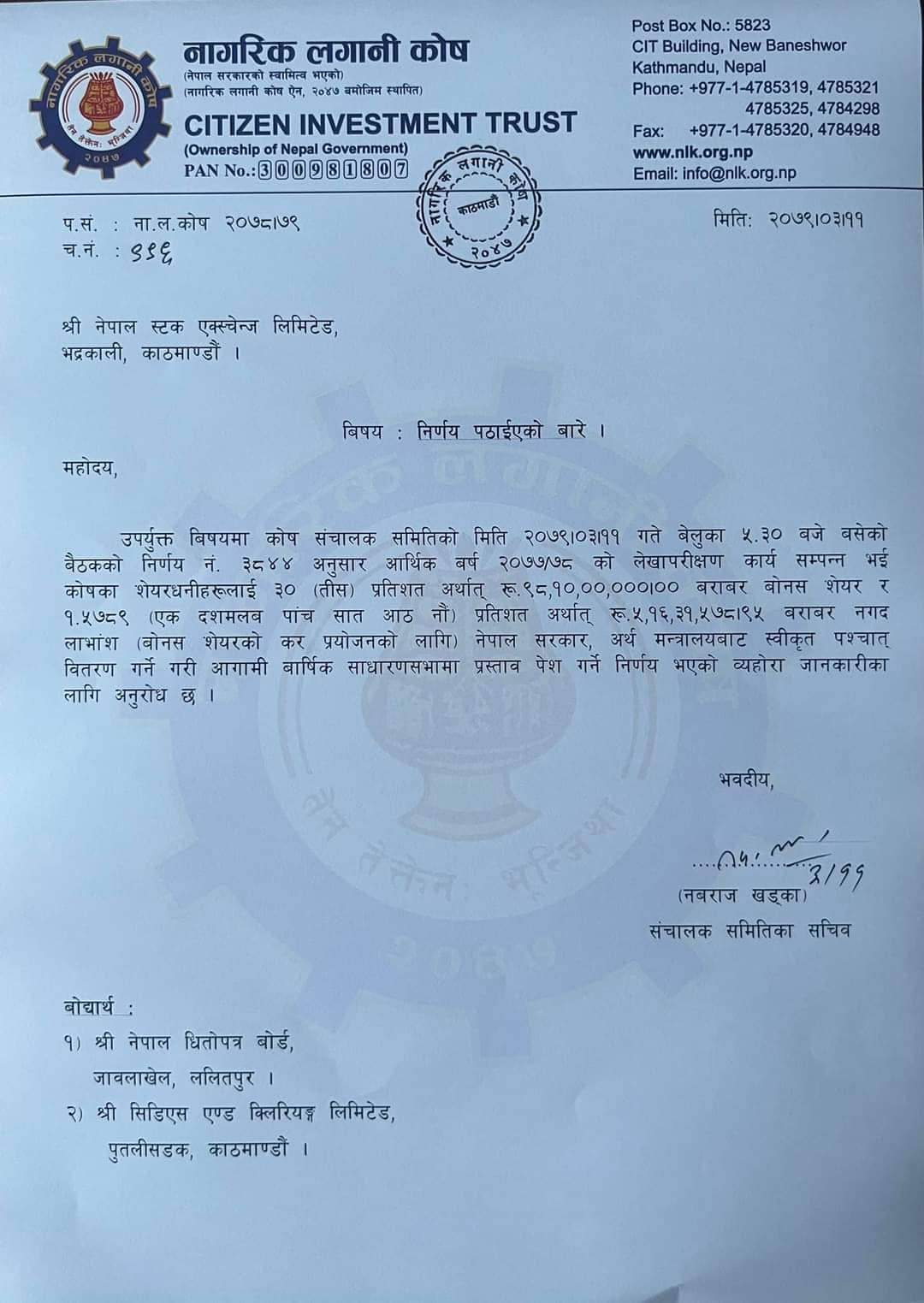 प्रस्तावित लाभांश अर्थ मन्त्रालय र कोषको आगामी साधारणसभाले पारित गरे पश्चात् शेयरधनीले पाउनेछन ।