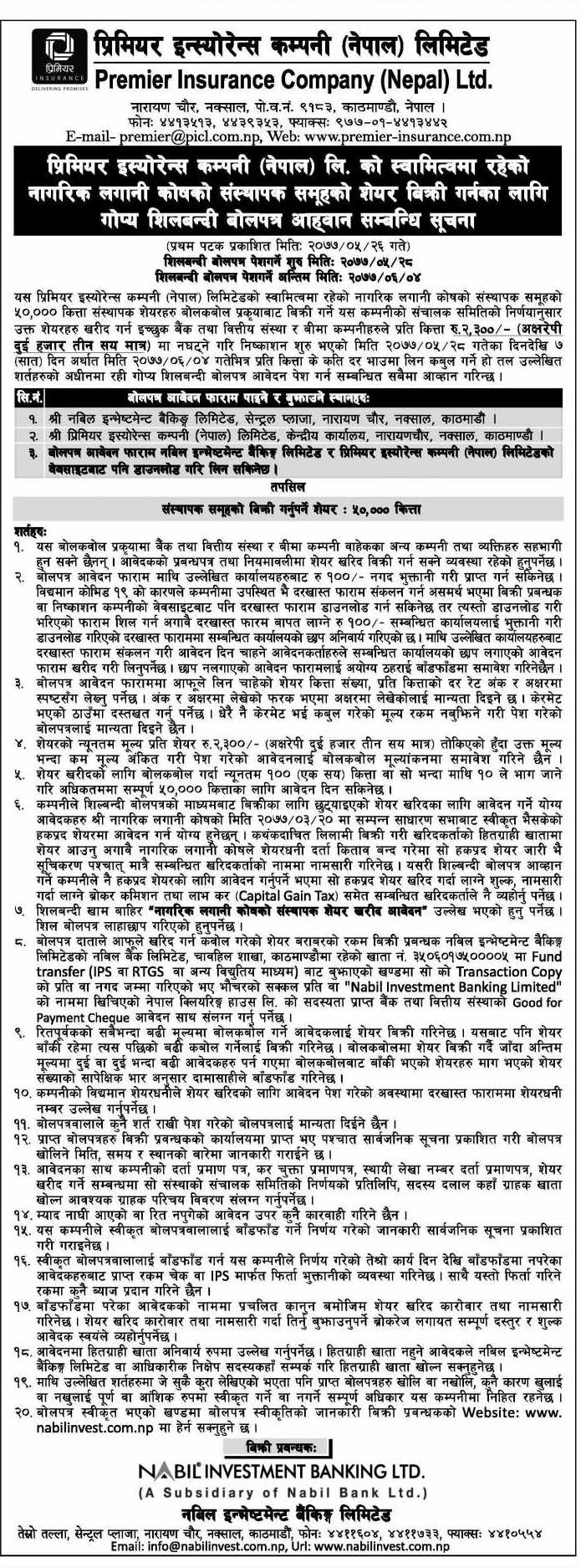 काठमाडौं । प्रिमियर इन्स्योरेन्स कम्पनी लिमिटेडको स्वामित्वमा रहेको नागरिक लगानी कोषको संस्थापक समूहको शेयरमा आजबाट शिलबन्दी बोलपत्र पेश गर्न सकिनेछ । कोषको संस्थापक समूहको ५० हजार कित्ता शेयरहरू प्रिमियर इन्स्योरेन्सले बोलकबोल प्रकृयाबाट बिक्री गर्न लागेको हो ।