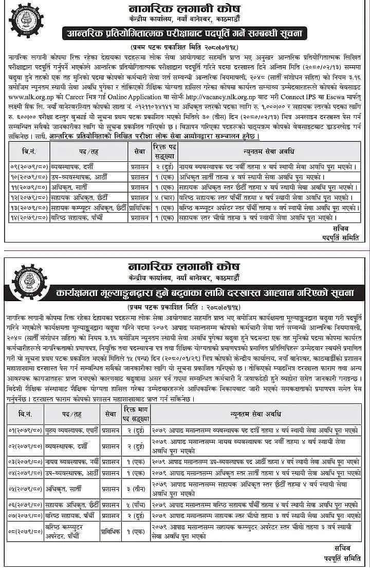 काठमाडौं । नागरिक लगानी कोषले खुला तथा आन्तरिक प्रतियोगितात्मक परीक्षाबाट पदपुर्ति गर्ने भएको छ । जसका लागि कोषले आन्तरिक तथा खुला प्रतियोगिता मार्फतमा रिक्त रहेका पदको पदपुर्ति गर्न लागेको हो । कोषले आन्तरिकबाट व्यवस्थापक दशौंका लागि २ जना, उप व्यवस्थापकका लागि १ जना, अधिकृतका लागि १ जना, सहायक अधिकृतका लागि ४ जना, सहायक कम्प्युटरका लागि १ जना र वरिष्ठ सहायकका लागि १ जना गरी कुल १० जना पदपुर्ति गर्ने जनाएको छ ।