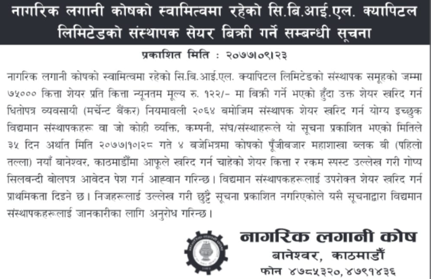 काठमाडौं । नागरिक लगानी कोषले आफ्नो स्वामित्वमा रहेको सिबिआईएल क्यापिटलको संस्थापक शेयर लिलाम गर्ने भएको छ । कोषले एक सुचना जारी गर्दै क्यापिटलको ७५ हजार कित्ता शेयर न्युनतम मूल्य प्रति कित्ता १२२ कायम गरी लिलाम गर्ने जनाएको छ ।