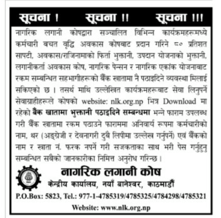 काठमाडौं । नागरिक लगानी कोषले आफ्ना सेवाग्राहीको लागि नयाँ योजना ल्याएको छ । कोषले सञ्चालन गरेको विभिन्न कार्यक्रममध्ये कर्मचारी वचत बृद्धि अवकास कोषबाट प्रदान गरिने ८० प्रतिशत सापटी,अवकास फिर्ता भुक्तानी, उपदान योजनाको भुक्तानी, लगानीकर्ता अवकास कोष, नागरिक पेन्सन र नागरिक एकांक योजनाबाट रकम सम्बन्धित सहभागीहरुको बैंक खातामा नै पठाइदिने ब्यवस्था मिलाएको छ ।
