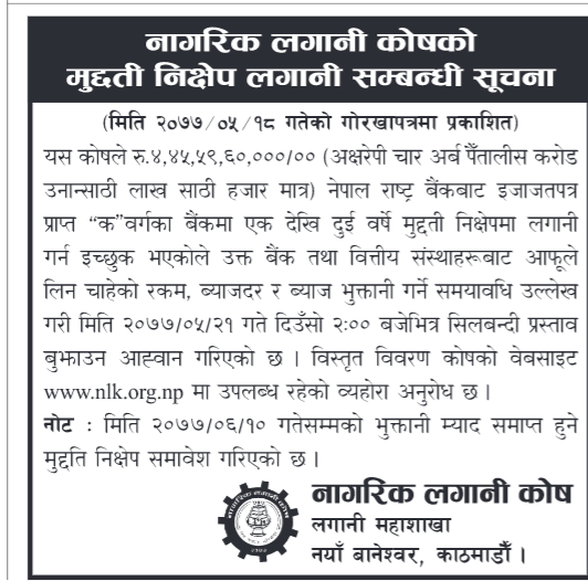 कोषले एक सुचना जारी गर्दै निक्षेप लिन चाहाने क’ वर्गका वाणिज्य बैंकहरुलाई आफुले लिन चाहेको रकम, निक्षेपमा प्रदान गर्ने ब्याजदर र ब्याज भुक्तान गर्ने अवधि समेत उल्लेख गरी आवेदन पेश गर्न आग्रह गरेको छ ।
