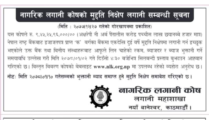 बैंशाख १० गते म्याद सकिनु अगावै कोषले बोलकबोल गर्ने भएको हो । बैंक तथा वित्तीय संस्थाहरुको लागि यस्ता कोषको रकम निक्षेपको बलियो स्रोतका रुपमा रहने गरेको छ । २ वर्ष अवधिका लागि निक्षेप सकार्न पाउने भएकाले बाणिज्य बैंकहरु विच व्याजदरमा चर्को प्रतिस्पर्धा हुने गरेको छ ।