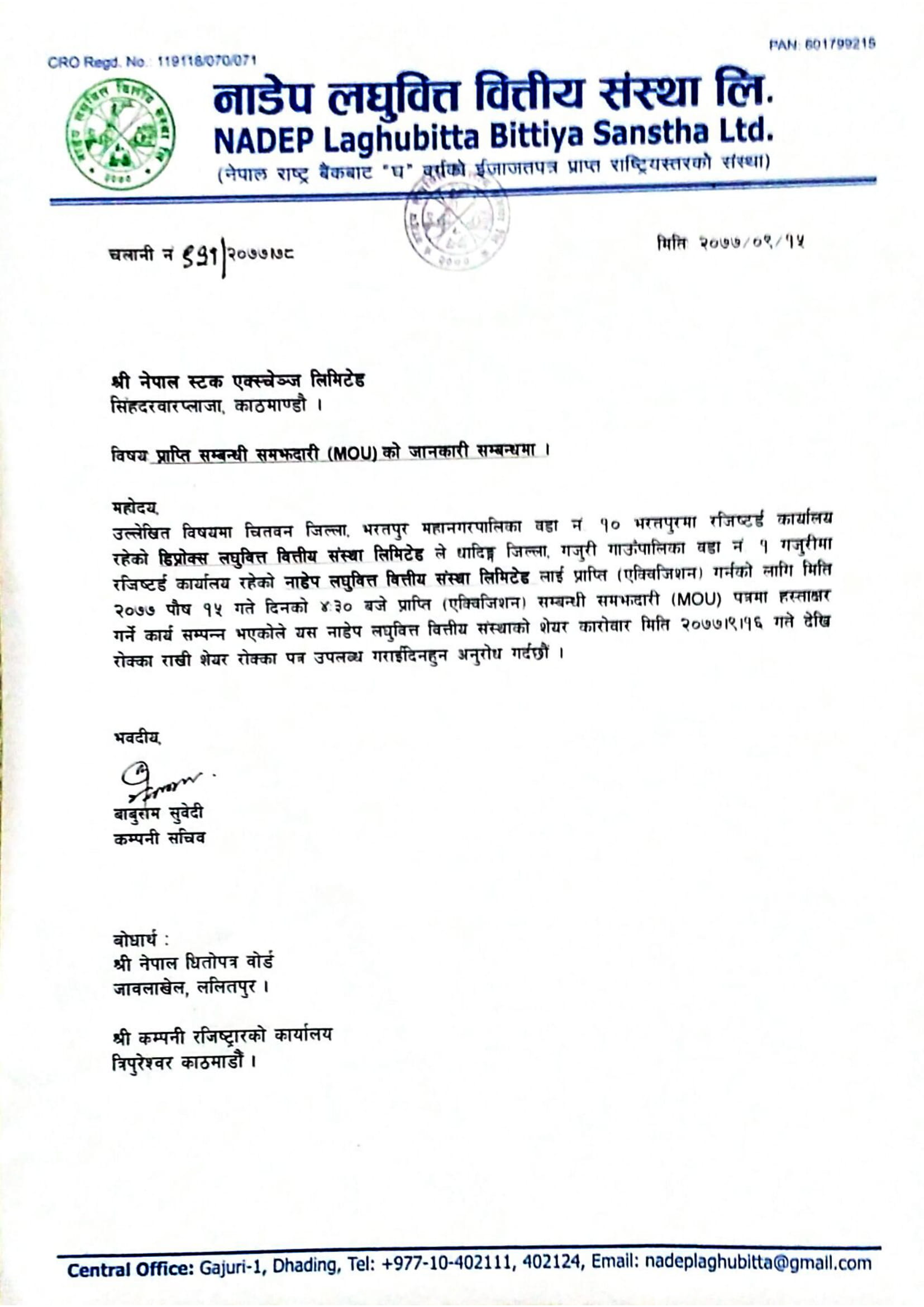 डिप्रोक्स लघुवित्त वित्तीय संस्था लिमिटेडले नाडेप लघुवित्त वित्तीय संस्था लिमिटेडलाई प्राप्ति गर्ने सम्बन्धि सहमति पत्रमा हस्ताक्षर भएको छ ।