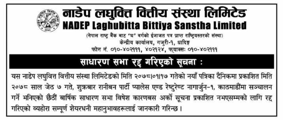 काठमाडौं । नाडेप लघुवित्त वित्तीय संस्था लिमिटेडको वार्षिक साधारण सभा रद्द भएको छ । संस्थाको जेठ ७ गते शुक्रबार गर्ने भनिएको छैटौं साधारण सभा रद्द गरिएको सूचना प्रकाशन गर्दै जनाएको छ ।