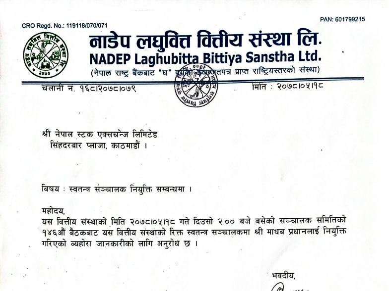 काठमाडौं । नाडेप लघुवित्त वित्तीय संस्थाको स्वतन्त्र सञ्चालकमा माधव प्रधान नियुक्त भएका छन् । कम्पनीको गत शुक्रवार बसेको सञ्चालक समितिको बैठकले उक्त पदका प्रधानलाई नियुक्त गरेको हो ।