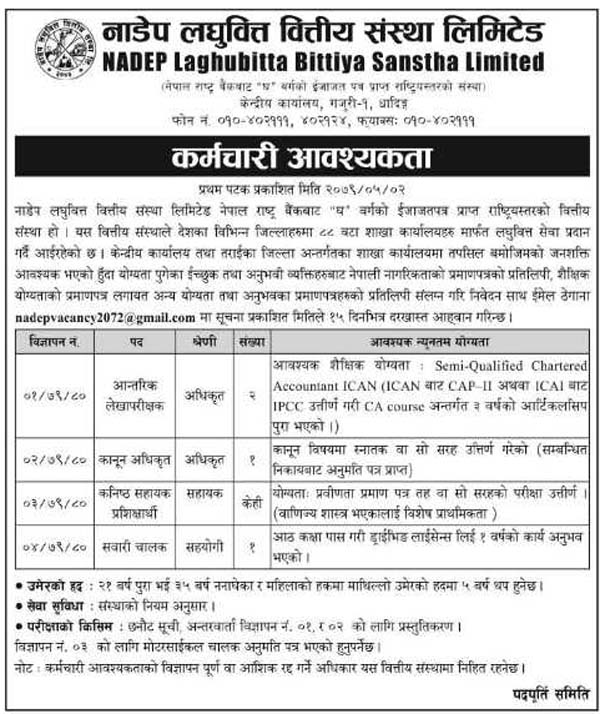 काठमाडौं । नाडेप लघुवित्त वित्तीय संस्था लिमिटेडले विभिन्न पदका लागि कर्मचारीको माग गरेको छ । कम्पनीले आन्तरिक लेखापरिक्षकका लागि २ जना, कानून अधिकृतका लागि १ जना, कनिष्ठ सहायक प्रशिक्षार्थीका लागि केही संख्यामा र सवारी चालकका लागि एक जना कर्मचारी माग गरेको जनाएको छ ।