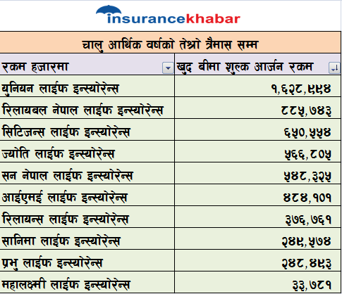 यस आर्थिक वर्षको तेश्रो त्रैमास सम्म सबै भन्दा धेरै बीमा शुल्क आर्जनमा युनियन लाईफ इन्स्योरेन्स पर्दछ। युनियन लाईफ इन्स्योरेन्सले यस आर्थिक वर्षको तेश्रो त्रैमास सम्म १ अर्ब ६२ करोड खुद बीमा शुल्क आर्जन गर्न सफल भएको छ।