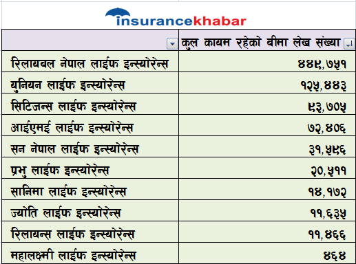 बीमा लेख संख्याको आधारमा भने रिलायबल नेपाल लाईफ इन्स्योरेन्स अगाडी छ। रिलायबल नेपाल लाईफ इन्स्योरेन्समा ४ लाख ४९ हजार कुल बीमा लेख संख्या कायम छन्। त्यस्तै दोश्रोमा युनियन लाईफ इन्स्योरेन्स पर्दछ। युनियन लाईफ इन्स्योरेन्समा हाल सम्म १ लाख २५ हजार कुल बीमा लेख संख्या कायम छन्। तेश्रोमा सिटिजन्स लाईफ इन्स्योरेन्स पर्दछ। सिटिजन्स लाईफ इन्स्योरेन्समा हाल सम्म ९३ हजार बीमा लेख संख्या कायम छन्।