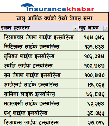 चालु आर्थिक वर्षको तेश्रो त्रैमास सम्मलाई आधार मान्दा रिलायबल नेपाल लाईफ इन्स्योरेन्सको खुद नाफा सबै भन्दा धेरै छ। उपलब्ध तथ्यांकलाई आधार मान्दा रिलायबल नेपाल लाईफ इन्स्योरेन्स कम्पनीले १५ करोड ४२ लाख खुद नाफा गरेको छ।