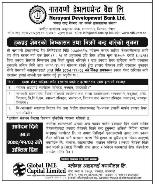लगानीकर्ताले बिक्री प्रबन्धक ग्लोबल आइएमई क्यापिटल लिमिटेड जमल काठमाडौँ, नारायणी डेभलपमेन्ट बैंकको केन्द्रिय तथा शाखा कार्यालयहरु र नेपाल धितोपत्र बोर्डबाट स्वीकृती प्राप्त गरेका सम्पूर्ण सि(आस्वा सेवामा सहभागी बैंक तथा वित्तीय संस्था र तिनका शाखा कार्यालयहरुबाट आवेदन दिन सक्नेछन् ।