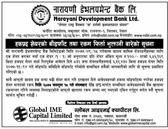 काठमाडौं । नारायणी डेभलपमेन्ट बैंक लिमिटेडले निष्काशन तथा बिक्री खुल्ला गरेको हकप्रद शेयर बाँडफाँड भएको छ । बैंकले १ः१ अर्थात एक कित्ता शेयर बराबर एकको अनुपातमा ६ करोड ५६ लाख १६ हजार ९ सय रुपैयाँ बराबरको ६ लाख ५६ हजार १ सय ६९ कित्ता हकप्रद शेयर निष्काशन गरेको थियो ।