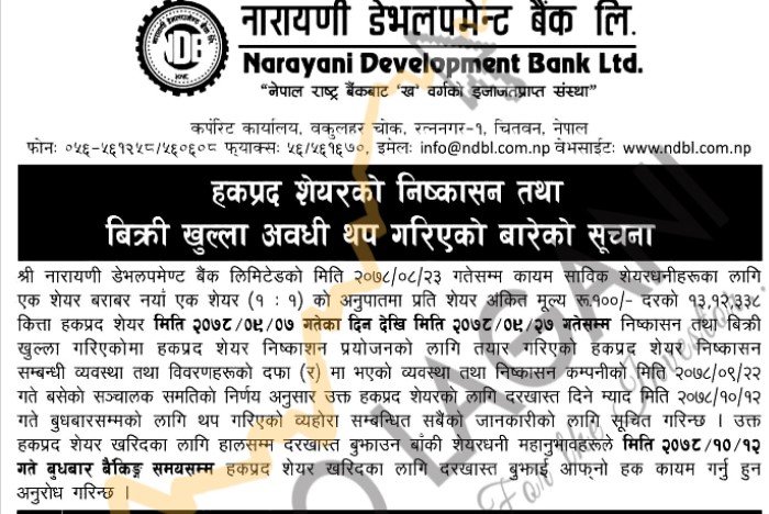 बैंकले हकप्रद निष्काशनको लागि मङ्सिर २४ गतेसम्म बुक क्लोज गर्ने निर्णय गरेको थियो । मङ्सिर २३ गतेसम्म कायम शेयरधनीहरुले मात्रै नारायणी डेभलपमेन्टको हकप्रद भर्न पाउने छन्।