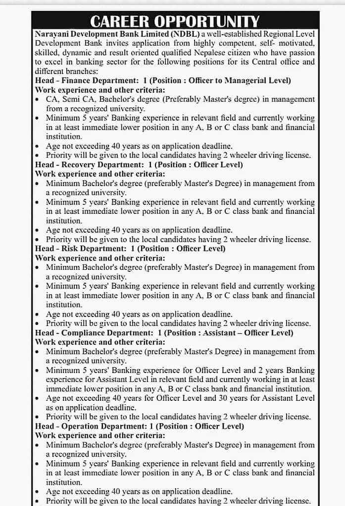 काठमाडौं । नारायणी डेभलपमेन्ट बैंकले धेरै पदका लागि कर्मचारी माग गरेको छ । बैंकले फाइनान्स डिपार्टमेन्टमा अफिसरदेखि म्यानेजरियलका लागि १ जना, रिकभरि डिपार्टमेन्टमा अफिसरका लागि १ जना, रिक्स डिपार्टमेन्टमा अफिसर लेभलका लागि १ जना, कम्प्लेन्स डिपार्टमेन्टमा असिस्टेन्ट अफिसरका लागि १ जना, अपरेशन डिपार्टमेन्टमा अफिसरका लागि १ जना, आइटी डिपार्टमेन्टमा असिस्टेन्टदेखि अफिसर लेभलका लागि केही, ब्रान्च म्यानेजरमा जुनियर अफिसर र अफिसरका लागि केही माग गरेको हो ।