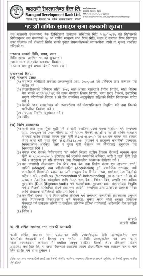 काठमाडौं । नारायणी डेभलपमेन्ट बैंक लिमिटेडले १८औं वार्षिक साधारण सभा आश्विन १६ गते आज हुने भएइको छ । बैंकको भाद्र २५ गते बिहीबार बसेको सञ्चालक समितिको बैठकले गरेको निर्णय अनुसार उक्त सभाको मिति तय गरेको हो । उक्त सभा स्टार व्याङ्क्वेट रत्ननगर, चितवनमा दिउँसो १ बजेबाट सुरू गर्ने जनाएको छ ।