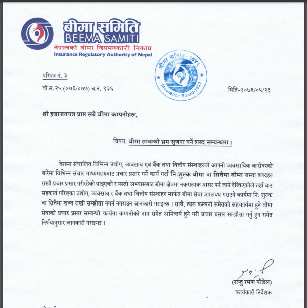 बीमा समितिद्धारा जारी गरिएको परिपत्रमा देशमा संचालित विभिन्न उद्योग एवं बैंक तथा वित्तीय संस्थाहरुले आफ्नो व्यवसायिक कारोबारमा संचार माध्यमहरुबाट प्रचार प्रसार गर्दा ‘निःशुल्क बीमा’ वा ‘सित्तैमा बीमा’ जस्ता शब्दहरु राखेको पाइएको र यस्तो अभ्यासबाट बीमा क्षेत्रमा नकारात्मक असर पर्न जाने देखिएकोले बीमा समितिबाट इजाजत प्राप्त जीवन तथा निर्जीवन बीमा कम्पनीहरुलाई आफुले सहकार्य गरिएका संस्थामार्फत बीमा सेबा उपलब्ध गराउने कार्यमा ‘निःशुल्क’ वा ‘सित्तैमा’ शब्द राखी सम्झौता नर्गन तथा नगराउन समेत निर्देशन दिएको छ ।