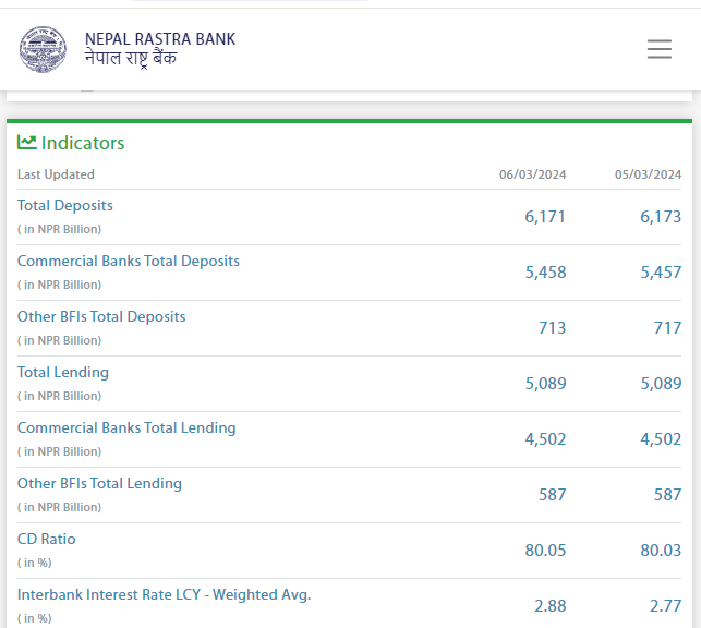 त्यस्तै मंगलबारसम्म कर्जा प्रवाह ५० खर्ब ८९ अर्ब रहेकोमा बुधबार भने कुनै घटबढ भएन । बुधबारसम्म वाणिज्य बैंकमा निक्षेप ५४ खर्ब ५८ अर्ब पुगेको थियो भने वाणिज्य बैंकबाट ४५ खर्ब २ अर्ब कर्जा प्रवाह भएको छ ।