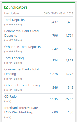सिडी रेसियो ८५ दशमलव ४५ प्रतिशत छ । अन्तर बैंक ब्याजदर ७ प्रतिशत छ । यी दुवै सूचक अघिल्लो दिनको तुलनामा परिवर्तन भएको देखिएन ।