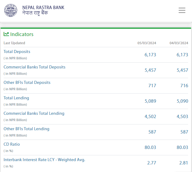 सीडी रेसियो ८०.०३ प्रतिशत कायम भएको छ भने अन्तरबैंक ब्याजदर २.७७ प्रतिशत छ । एक दिनको अवधिमा सीडी रेसियोमा कुनै परिवर्तन भएन ।