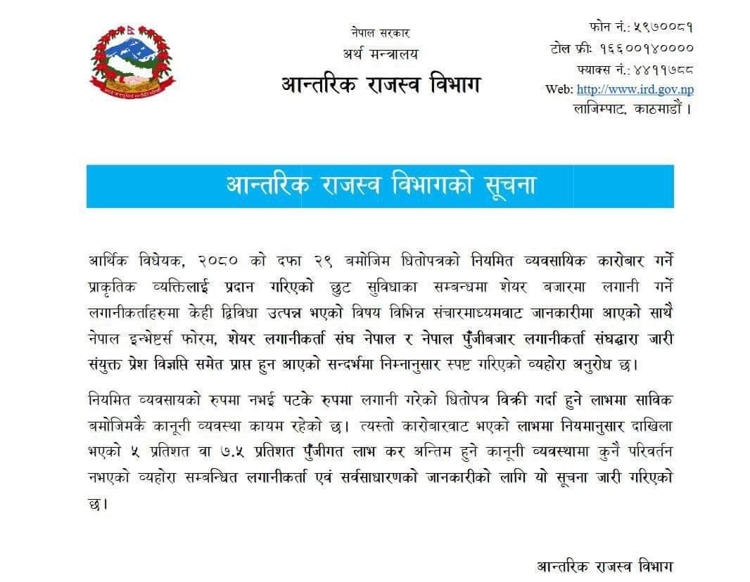 यस्तो कारोबारबाट भएको लाभमा नियमानुसार दाखिला भएको ५ प्रतिशत वा ७.५ प्रतिशत पूँजीगत लाभकर अन्तिम हुने कानुनी व्यवस्थामा कुनै परिवर्तन नभएको व्यवस्था सम्बन्धी लगानीकर्ता एवं सर्वसाधारणको जानकारी लागि सूचना नै जारी गरिएको छ ।