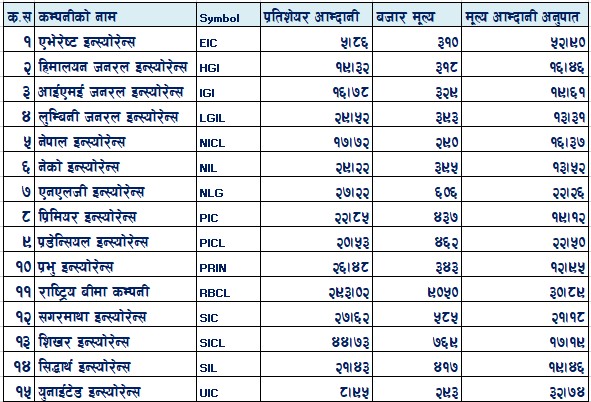 निर्जिवन बीमा कम्पनीहरुको औषत मूल्य आम्दानी अनुपात २२ गुणा, कस्को कति ?