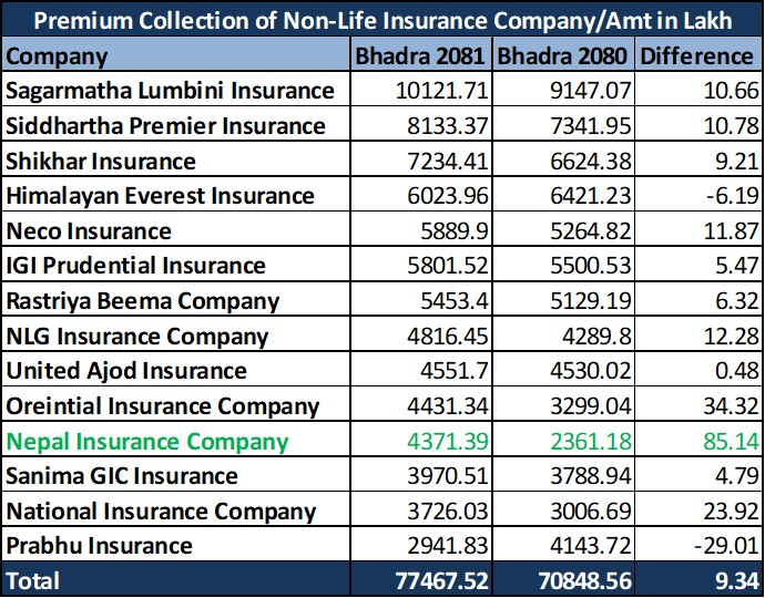 गत आर्थिक वर्षको तुलनामा निर्जीवन बीमकहरुको व्यापार ९.३४ प्रतिशतले बढेको छ। गत वर्ष भदौमा निर्जीवन बीमकहरुले ७ अर्ब ८ करोड ४८ लाख रुपैयाँ कुल बीमाशुल्क आर्जन गरेका थिए। गत वर्षको तुलनामा यो वर्ष १२ वटा बीमकको व्यापार बढेको छ भने दुईवटाको घटेको छ।
