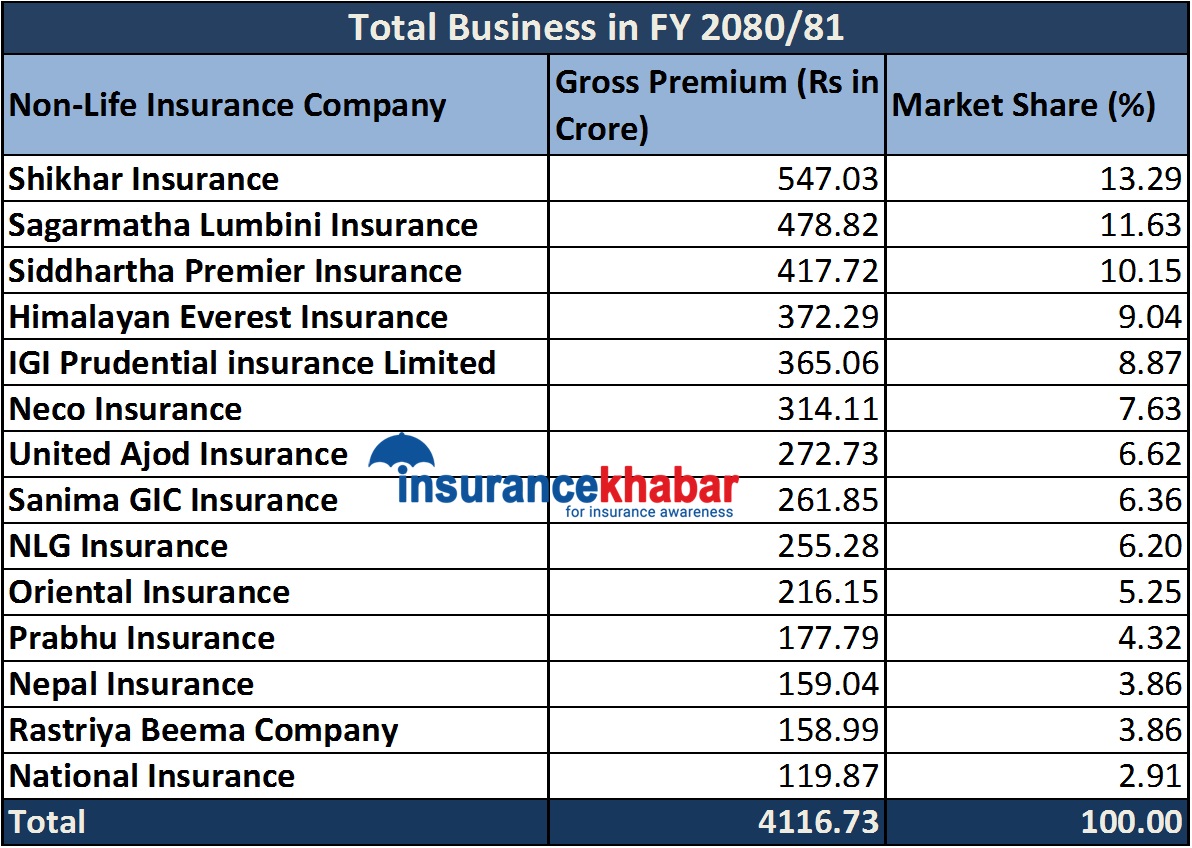 तथ्यांकअनुसार आव २०८०।८१ मा सर्वाधिक व्यवसाय गर्नेमा शिखर इन्स्योरेन्स रहेको छ। यो कम्पनीले ५ अर्ब ४७ करोड ३ लाख रुपैयाँ कुल बीमाशुल्क आर्जन गरेको छ।