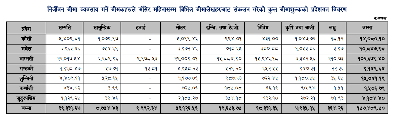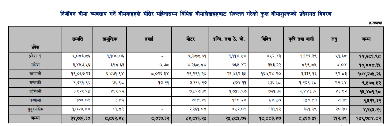 प्राधिकरणका अनुसार गत आवको मंसिर महिनासम्मको व्यवसायको तुलनामा चालू आवको सोही अवधिमा मोटर बीमाशुल्क आम्दानी सातवटै प्रदेशमा खुम्चिएको छ। यसको विपरित सम्पत्ती बीमावापतको बीमाशुल्क आम्दानी सातवटै प्रदेशमा वृद्धि देखिएको छ।