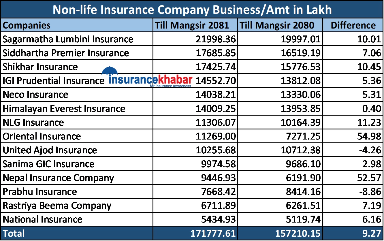 यसैगरी चालु आर्थिक वर्षको मंसिरसम्म आईजीआई प्रुडेसिन्यलले १ अर्ब ४५ करोड ५२ लाख रुपैयाँ, नेकोले १ अर्ब ४० करोड ३८ लाख रुपैयाँ, हिमालयन एभरेष्टले १ अर्ब ४० करोड ९ लाख रुपैयाँ, एनएलजीले १ अर्ब १३ करोड ६ लाख रुपैयाँ र ओरिएन्टलले १ अर्ब १२ करोड ६९ लाख रुपैयाँ कुल बीमाशुल्क आर्जन गरेका छन्। अघिल्लो वर्षको तुलनामा समीक्षा अवधिमा आईजीआई प्रुडेसिन्यलको व्यापार ५.३६ प्रतिशत, नेकोको ५.३१ प्रतिशत, हिमालयन एभरेष्टको ०.४० प्रतिशत, एनएलजीको ११.२३ प्रतिशत र ओरिएन्टलको ५४.९८ प्रतिशतले बढेको छ। वृद्धिदरका हिसाबले ओरिएन्टल अग्रस्थानमा रहेको छ।