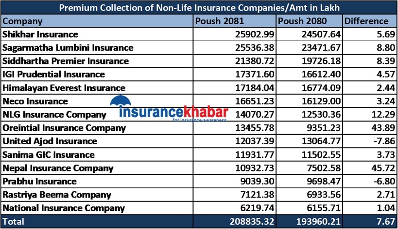 यसैगरी चालु आर्थिक वर्षको पुससम्म आईजीआई प्रुडेन्सियल इन्स्योरेन्सले १ अर्ब ७३ करोड ७१ लाख रुपैयाँ, हिमालयन एभरेस्ट इन्स्योरेन्सले १ अर्ब ७१ करोड ८४ लाख रुपैयाँ, नेको इन्स्योरेन्सले १ अर्ब ६६ करोड ५१ लाख रुपैयाँ, एनएलजी इन्स्योरेन्सले १ अर्ब ४० करोड ७० लाख रुपैयाँ र ओरिएन्टल इन्स्योरेन्सले १ अर्ब ३४ करोड ५५ लाख रुपैयाँ कुल बीमाशुल्क आर्जन गरेका छन्। अघिल्लो वर्ष यही अवधिसम्मको तुलनामा समीक्षा अवधिमा आईजीआई प्रुडेन्सियलको ४.५७ प्रतिशत, हिमालयन एभरेष्टको २.४४ प्रतिशत, नेकोको ३.२४ प्रतिशत, एनएलजीको १२.२९ प्रतिशत र ओरिएन्टलको ४३.८९ प्रतिशतले व्यापार बढेको छ।