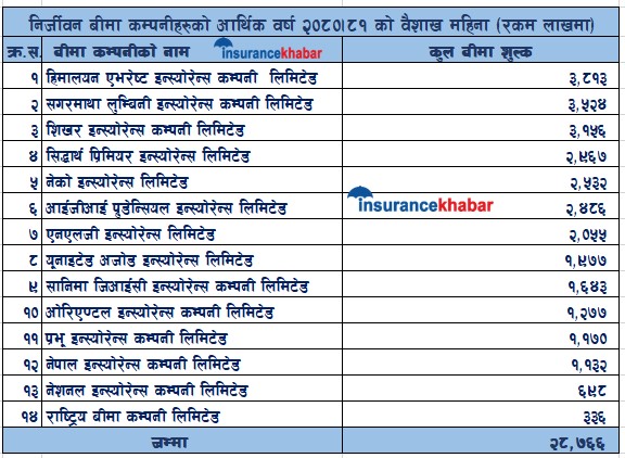 वैशाखमा सबैभन्दा धेरै व्यापार हिमालयन एभरेष्ट इन्स्योरेन्सले गरेको छ। यो कम्पनीले ३८ करोड १३ लाख रुपैयाँ कुल बीमाशुल्क आर्जन गरेको छ।