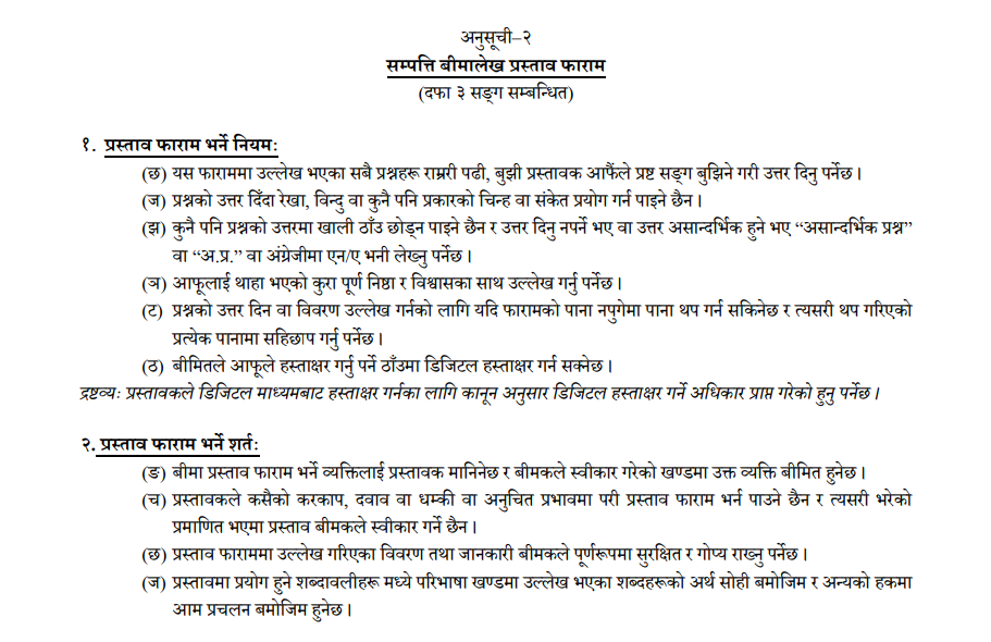 सम्पत्ती बीमा निर्देशनकाे अनसूची २ मा सम्पत्ती बीमालेख प्रस्ताव फारम सम्बन्धी प्रावधान अन्तर्गत प्रस्ताव फाराम भर्ने नियम अन्तर्गत बीमितले आफूले हस्ताक्षर गर्नुपर्ने ठाउँमा डिजिटल हस्ताक्षर गर्न सक्ने उल्लेख छ। डिजिटल हस्ताक्षर प्रयाेग गर्न चाहने बीमितले कानून अनुसार डिजिटल हस्ताक्षर गर्ने इजाजत लिएकाे हुनुपर्नेछ।