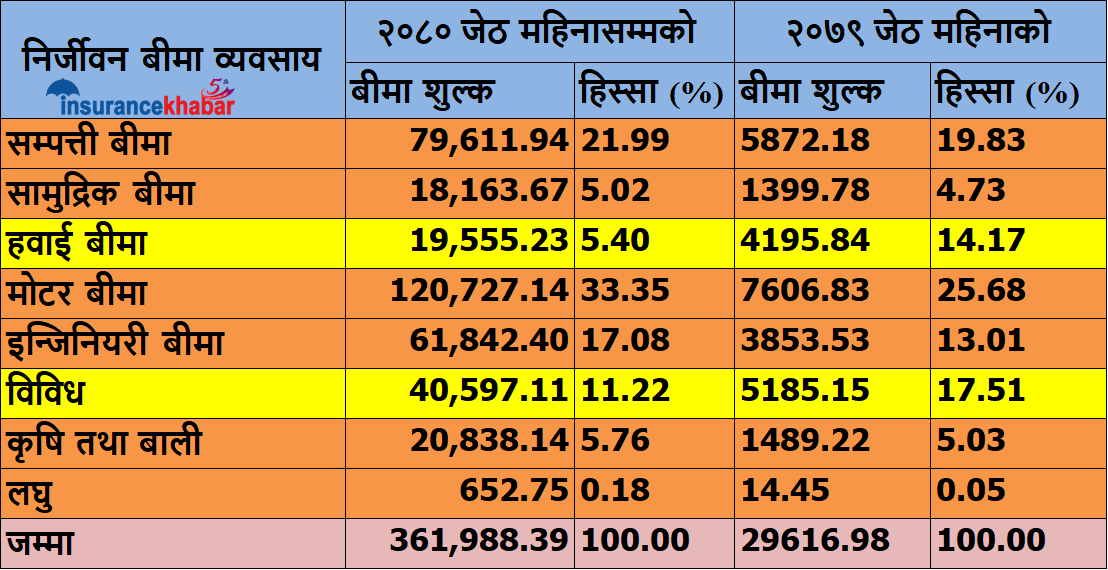 जेठ महिनासम्ममा कुल बीमा शुल्क आर्जन ३६ अर्ब १९ करोड रहेको छ । जसमा मोटरले मात्रै ३३ प्रतिशत बजार ओगटेको छ । यस वर्ष हवाई बीमा व्यवसायमा भने उल्लेख्य सुधार देखिदैन । हवाइको बजार हिस्सा ५.४० प्रतिशत मात्रै छ । यस वर्ष हवाई र विविधको पोर्टफेलियो तल झरेको छ । मोटर बाहेक अन्य पोर्टफेलियोको हिस्सामा खासै सुधार देखिदैन ।