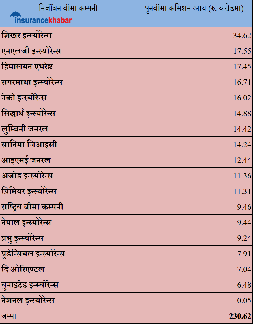 सगरमाथाले १६ करोड ७१ लाख रुपैयाँ, नेको इन्स्योरेन्स कम्पनी १६ करोड २ लाख, सिद्धार्थ १४ करोड ८८ लाख, लुम्बिनी १४ करोड ४२ लाख, सानिमा जिआइसी १४ करोड २४ लाख, आइएमई जनरल १२ करोड ४४ लाख, अजोड ११ करोड ३६ लाख, प्रिमियर ११ करोड ३१ लाख, राष्ट्रिय बीमा कम्पनी ९ करोड ४६ लाख, नेपाल इन्स्योरेन्स ९ करोड ४४ लाख, प्रभु ९ करोड २४ लाख, प्रुडेन्सियल ७ करोड ९१ लाख, दि ओरिएण्टल ७ करोड ४ लाख, युनाइटेड इन्स्योरेन्स ६ करोड ४८ लाख र नेशनल इन्स्योरेन्स कम्पनीले ५ लाख रुपैयाँ मात्रै पुनर्बीमा कम्पनी बुझेको छ ।
