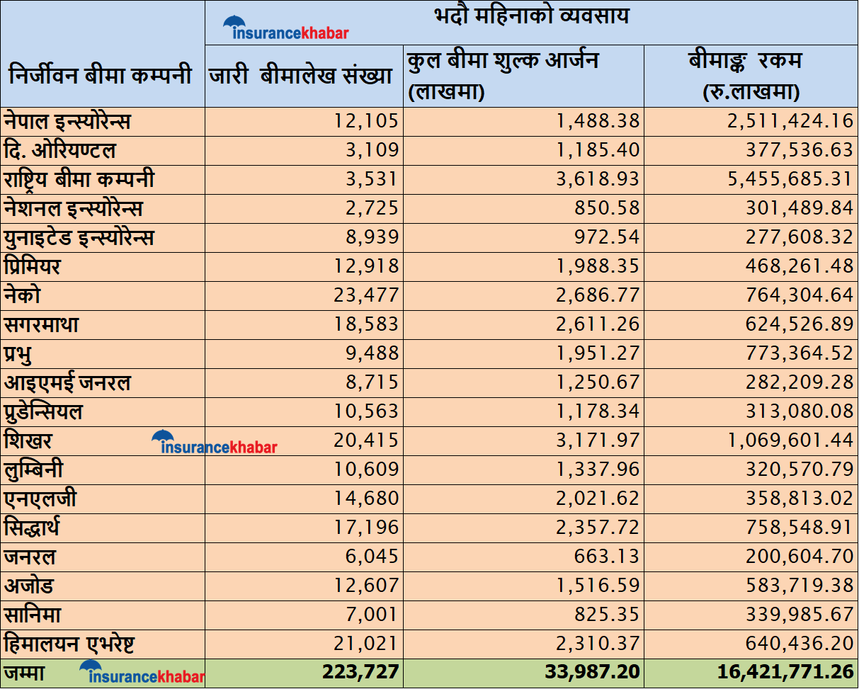 भदौ महिनामा सर्वाधिक धेरै राष्ट्रिय बीमा संस्थाले ३६ करोड १८ लाख रुपैयाँ बीमा शुल्क आर्जन गरेको छ । कम्पनीले गत साउनमा ८४ करोड २८ लाख रुपैयाँ बीमा शुल्क आर्जन गरेको थियो । कम्पनीले सरकारी स्तरबाट हुने बीमाको नविकरण मार्फत उक्त बीमा शुल्क आर्जन गरेको थियो । तर भदौमा सोहि अनुपातमा व्यवसाय नभित्रिदा समग्र निर्जीवन बीमा कम्पनीहरुकै व्यवसाय घटेको देखिएको हो ।