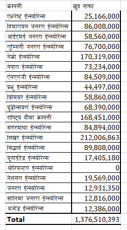 तथ्यांक अनुसार शिखर इन्स्योरेन्स सबैभन्दा धेरै मुनाफा आर्जन गरेका छ । कम्पनीले दोस्रो त्रैमास अवधिमा २१ करोड २० करोड रुपैयाँ मुनाफा आर्जन गरेको छ । त्यस्तै गरी नेको इन्स्योरेन्स धेरै नाफा आर्जन गर्ने कम्पनीमध्ये दोस्रोमा परेको छ । उक्त अवधिमा कम्पनीले १७ करोड ३ लाख रुपैयाँ खुद नाफा आर्जन गरेको छ भने राष्टिय बीमा कम्पनीले १६ करोड ८४ लाख रुपैयाँ खुद नाफा आर्जन गरेको छ ।