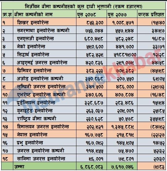 कम्पनीहरुले प्रकाशन गरेको वित्तीय विवरण अनुसार नेको इन्स्योरेन्सले ५९ करोड ६ लाख,सिद्धार्थ इन्स्योरेन्सले ५८ करोड २५ लाख रुपैयाँ,आइएमई जनरलले ४२ करोड ८ लाख रुपैयाँ, प्रिमियर इन्स्योरेन्सले ३८ करोड ३२ लाख रुपैयाँ, अजोड इन्स्योरेन्स कम्पनीले ३५ करोड ८ लाख रुपैयाँ, लुम्बिनी जनरल इन्स्योरेन्स कम्पनीले ३४ करोड १५ लाख रुपैयाँ, एभरेष्ट इन्स्योरेन्स कम्पनीले ३४ करोड ६ लाख रुपैयाँ कुल दाबी भुक्तानी गरेका छन् ।