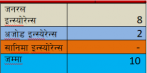 चालु आर्थिक वर्षको पहिलो त्रैमासको अवधिमा ३ नयाँ निर्जीवन बीमा कम्पनीहरुले १० वटा दाबीको दाबी भुक्तानी गरेका छन् । ३ नयाँ कम्पनीहरु मध्ये जनरल इन्स्योरेन्स कम्प्नीले ८ वटा दाबीको दाबी भुक्तानी गरेको छ । भने जनरल इन्स्योरेन्स कम्पनीले २ वटा दाबीको दाबी भुक्तानी गरेको छ ।