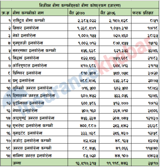 त्यसैगरी यस अवधिसम्ममा सगरमाथा इन्स्योरेन्स कम्पनीको बीमा कोषमा ९५ करोड ६६ लाख, सिद्धार्थ इन्स्योरेन्स कम्पनीकोे ९२ करोड २९ लाख, ओरिएण्टल इन्स्योरेन्स कम्पनीको ९१ करोड ७६ लाख, प्रिमियर इन्स्ययोरेन्स कम्पनीको ८१ करोड ५ लाख, प्रभु इन्स्योरेन्स कम्पनीको ७८ करोड ८९ लाख, लुम्बिनी जनरल इन्स्योरेन्स कम्पनीको ७१ करोड, हिमालयन जनरल इन्स्ययोरेन्स कम्पनीको ६० करोड ७४ लाख, प्रुडेन्सियल इन्स्योरेन्सको ६० करोड ५ लाख, नेपाल इन्स्योरेन्स कम्पनीको ५० करोड ७१ लाख रुपैयाँ रहेको छ ।