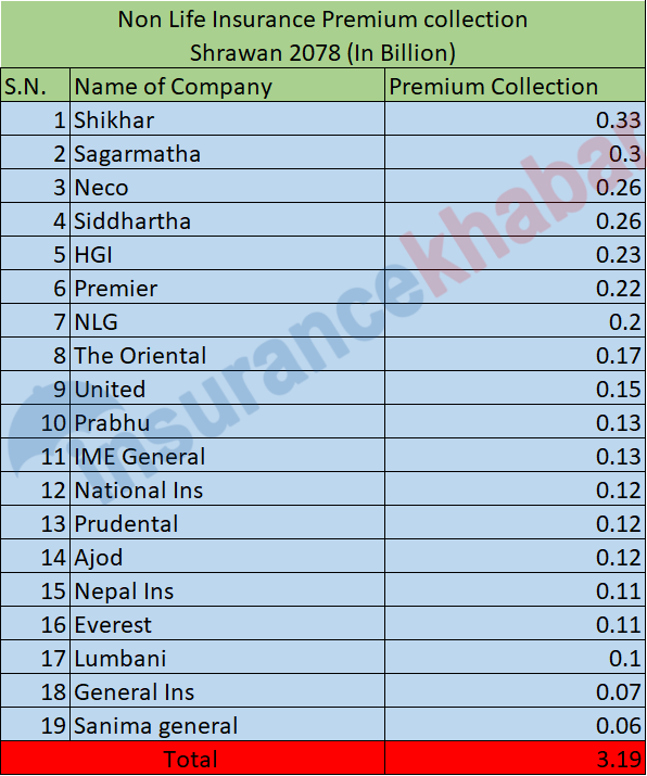 निर्जीवन बीमा कम्पनीहरुले साउन महिनामै संकलन गरे ३ अर्ब १९ करोड बीमा शुल्क, कुन कम्पनीको कति (सूचि सहित)