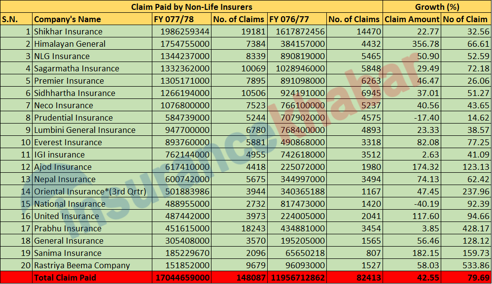 निर्जीवन बीमा कम्पनीहरुको दाबी भुक्तानी ४२ % बढ्यो, क्षति बापत बीमितले पाए १७ अर्ब ४ करोड
