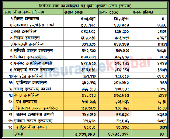 निर्जीवन बीमा कम्पनीहरुको खुद दाबी भुक्तानी २३ प्रतिशतले बढ्दा चार कम्पनीको घट्यो, कुनले कति गरे ?
