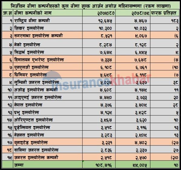यस अवधिसम्ममा सबैभन्दा धेरै राष्ट्रिय बीमा कम्पनीले आर्जन गरेको छ । कम्पनीले यस अवधिमा १ अर्ब २६ करोड व्यापार गरेको छ । गत आर्थिक वर्ष २०७८ /७९ को असोज मसान्तसम्मको तुलनामा राष्ट्रिय बीमा कम्पनीको कुल बीमा शुल्क आर्जन १८३ प्रतिशतले बढी हो । शिखर इन्स्योरेन्स कम्पनीले गत आर्थिक वर्षको असोजमसान्तसम्मको तुलनामा कुल बीमा शुल्क आर्जन २ प्रतिशतले बृद्धि गरेको छ ।