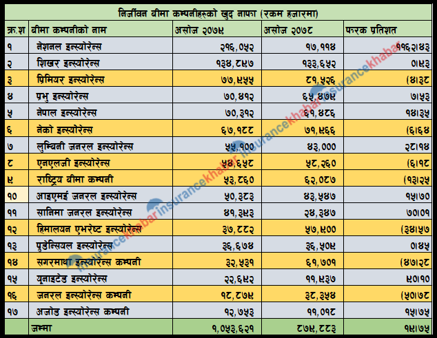 प्रुडेन्सियल इन्स्योरेन्स कम्पनीले गत आर्थिक वर्षको तुलनामा नाफा ० दशमलव ४५ प्रतिशतले बृद्धि गरेको छ । यस अवधिमा कम्पनीले ३ करोड ६६ लाख रुपैयाँ नाफा कमाएको छ । यस अवधिमा सगरमाथा इन्स्योरेन्स कम्पनीले ३ करोड २५ लाख रुपैयाँ नाफा कमाएको छ । गत आर्थिक वर्षको तुलनामा कम्पनकिो नाफा ४७ प्रतिशतले गिरावट आएको छ । यूनाइटेड इन्स्योरेन्स कम्पनीले गत आर्थिक वर्षको तुलनामा नाफा ९० प्रतिशतले बृद्धि गरी २ करोड २६ करोड कमाउन सफल भएको छ ।