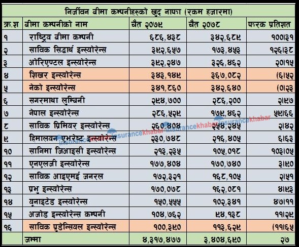 त्यस्तै, एनएलजी इन्स्योरेन्सले १७ करोड ७४ लाख, साविक आइएमई जनरलले १७ करोड २३ लाख, प्रभु इन्स्योरेन्सले १७ करोड, य्रूनाइटेड इन्स्योरेन्सले १५ करोड ५ लाख, अजोड इन्स्योरेन्सले १० करोड ४७ लाख र साविक प्रुडेन्सियल इन्स्योरेन्सले १० करोड ३ लाख रुपैयाँ नाफा आर्जन गरेका हुन् ।
