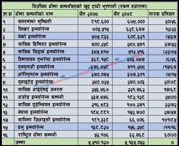 यस अवधिसम्ममा सबैभन्दा धेरै सगरमाथा लुम्बिनी इन्स्योरेन्स कम्पनीले दाबी भुक्तानी गरेको छ । गत आर्थिक वर्षको सोही अवधिको तुलनामा कम्पनीको दाबी भुक्तानी २० प्रतिशतले बढेको छ । यस अवधिमा कम्पनीले ८१ करोड ८६ लाख रुपैयाँ दाबी तिरेको छ ।