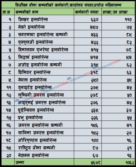 निर्जीवन बीमा क्षेत्रमा ५ हजार ६ सय कर्मचारी आबद्ध हुँदा शिखर सर्वाधिक ठूलो रोजगारदाता,कुन कम्पनीमा कति ?