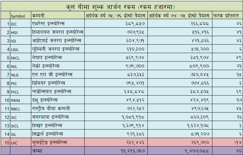 सबै भन्दा थोरै बीमा शुल्क आर्जन गर्नेमा युनाईटेड इन्स्योरेन्स पर्दछ। इन्स्योरेन्सले २३ करोड २४ लाख रुपैया कुल बीमा शुल्क आर्जन गरेको छ भने इन्स्योरेन्सले १५ करोड ५७ लाख खुद बीमा शुल्क आर्जन गरेको छ ।